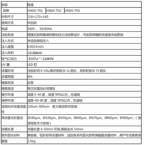 T型光纤涂覆机技术条件及说明书一、综述潍坊华纤光电科技2020年初推出两款全新的半自动/全自动光纤涂覆机(HXGK-T01、HXGK-T02),再涂覆的涂覆层直径200um~1000um,并可定制特殊或者更大直径,最快涂覆时间0.6秒。两款机型均采用便捷式的树脂储存器和压力注胶泵设计,可实现树脂的快速填充或更换,精准地控制每一次涂覆的注胶量。该系列高精度通用/保偏光纤涂覆机,做工精良、质量稳定,操...