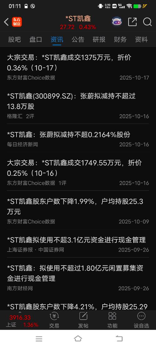 资讯 大宗交易:*ST凯鑫成交1375万元,折价0.36%(10-17)