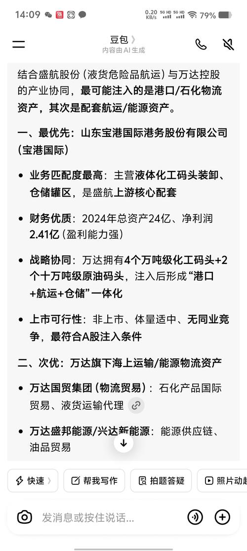 【问】尊敬的王总,我问豆包,他告诉我盛航股份和万达控股有整合资产注入的预期,请问公司是否考虑过,万达是否考虑过资产注入【答】盛航股份:尊敬的投资者您好!感谢您对公司的关注。公司选定《证券时报》《中国证券报》《上海证券报》和巨潮资讯网(www.cninfo.com.cn)为法定信息披露媒体,公司所有信息均以在上述媒体刊登的信息为准。谢谢!