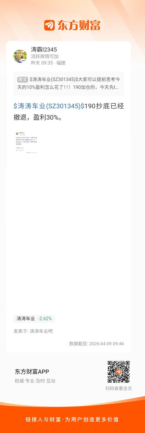 $涛涛车业(SZ301345)$再次买入!!//@涛霸l2345:$涛涛车业(SZ301345)$190抄底已经撤退,盈利30%。
