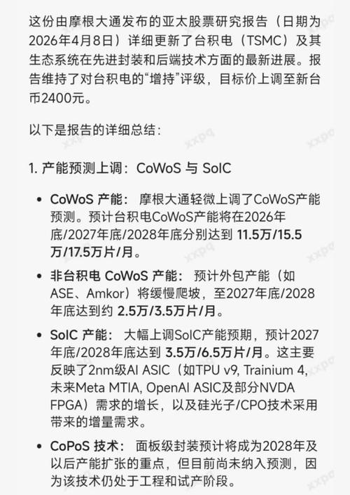 $汇成股份(SH688403)$三大利好,玻璃基板,存储扩产,以及cowos,cowop.苹果测试玻璃基板,汇成有玻璃基板。两长扩产预期,国内链柏诚股份连续大涨,汇成旗下鑫丰科技给长鑫做封测。收盘后传来cowos和cowop利好,汇成股份都有,见最后的图先发两份纪要。进封装产业技术趋势并表示订单外溢【DW电子】汇成股份新增重点推荐,低位先进封装优质大弹性票! 公司积极布局先进封装,提前预研COWO...