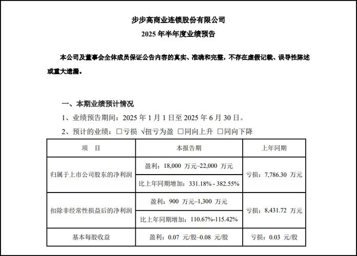 7月10日晚间,步步高披露2025年半年度业绩预告,经公司财务部门初步测算,预计2025年上半年实现归属于母公司所有者的净利润1.8亿元到2.2亿元,同比增加331.18%到382.55%;实现归属于母公司所有者的扣除非经常性损益的净利润900万元到1300万元,同比增加110.67%-115.42%。以“扭亏为盈+经营质效双升”的亮眼表现,展现零售转型的强劲势能。 步步高表示,上半年净利润大幅增...