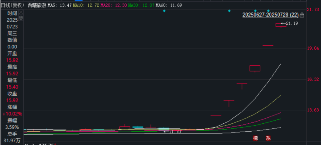 富凯摘要:雅下概念新高地。 作者|幕恩 雅下工程概念股开始降温,但由此推升的旅游概念威力不减。截至7月28日。西藏旅游股价迎来了第6个涨停板,涨至21.19元/股。 对此,公司于7月28日晚间发布公告表示,公司主营业务、生产经营情况以及经营环境与前期披露的信息相比未发生重大变化,不存在应披露而未披露的信息。 股价连续6涨停 据西藏旅游7月28日发布的公告显示,截至7月28日收盘,公司静态市盈率为2...