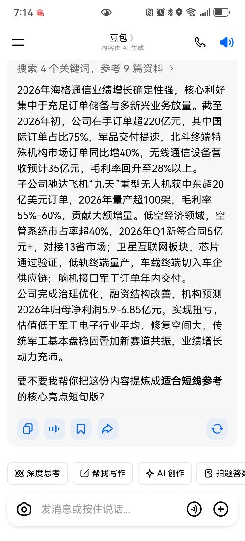1$海格通信(SZ002465)$海格通信2026年海格通信业绩增长确定性强,核心利好集中于充足订单储备与多新兴业务放量。截至2026年初,公司在手订单超220亿元,其中国际订单占比75%,军品交付提速,北斗终端特殊机构市场订单同比增40%,无线通信设备营收预计35亿元,毛利率回升至28%以上。 子公司驰达飞机“九天”重型无人机获中东超20亿美元订单,2026年量产超100架,毛利率55%-60%...