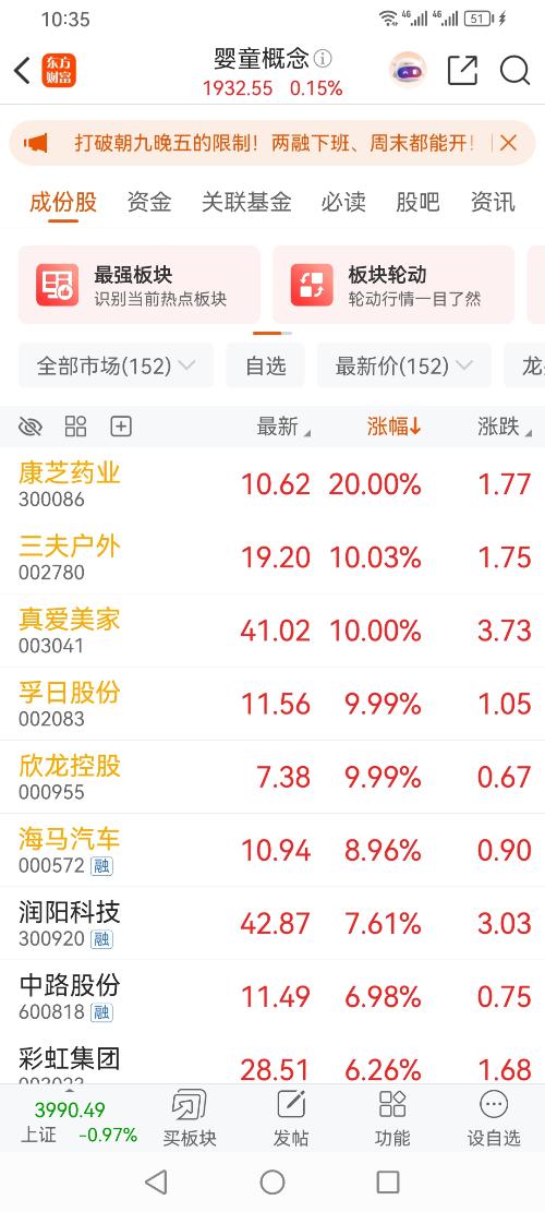$婴童概念(BK0664)$ 方军,三胎,婴童概念,今天涨停,孚日股份,康芝药业,三夫户外,欣龙控股,海马汽车 #沪指失守4000点!全面牛市何时到来?##收盘点评# #炒股日记#