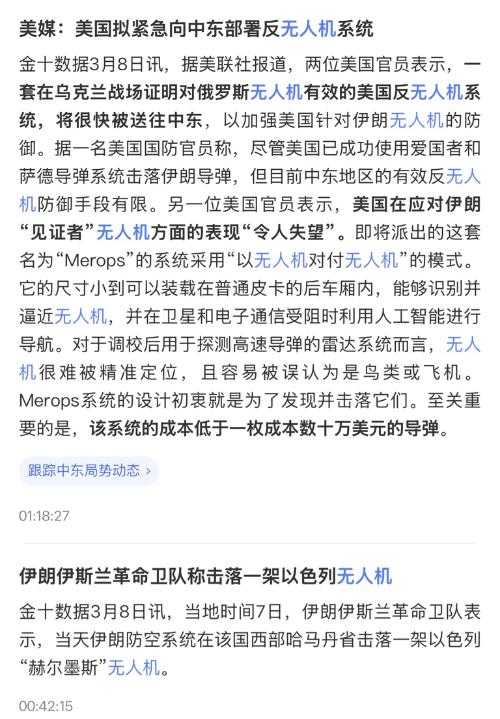 $中无人机(SH688297)$$航天彩虹(SZ002389)$仁者见仁,智者见智。反无人机方向,下周一计划:周一如果有低开或者平开小高开机会,我直接入场;如果高开比较多则先看承接,在分时均线上方承接比较好则低吸开底仓,如果航天彩虹涨停则打板如仓!买入逻辑,中东冲突持续发酵,伊朗通过无人机打击成效显著!中东各国无人机、反无人机相关需求迅速提升! 精选两只最核心、最直接受益伊美冲突+中东军贸的标的,...