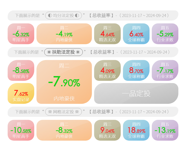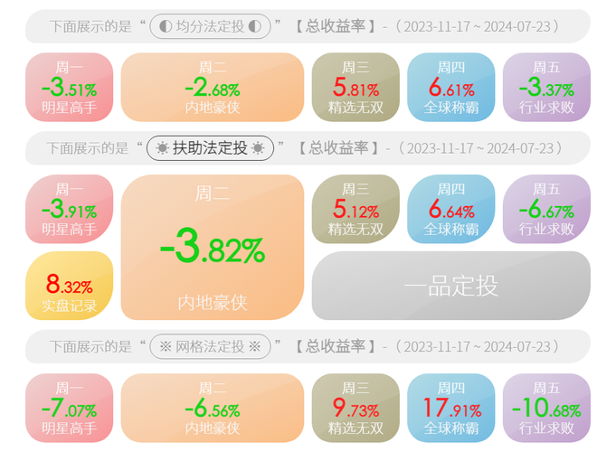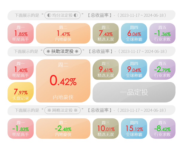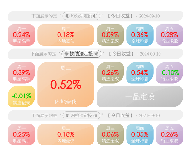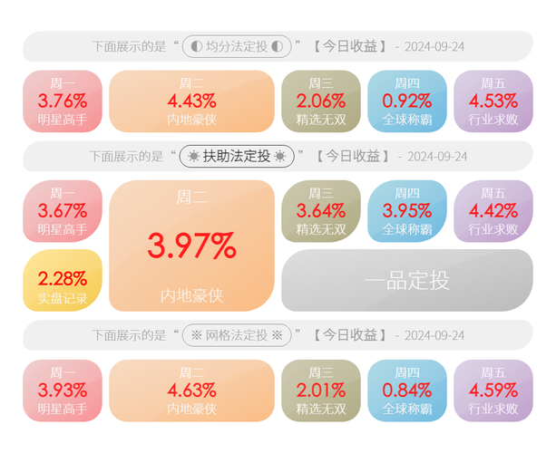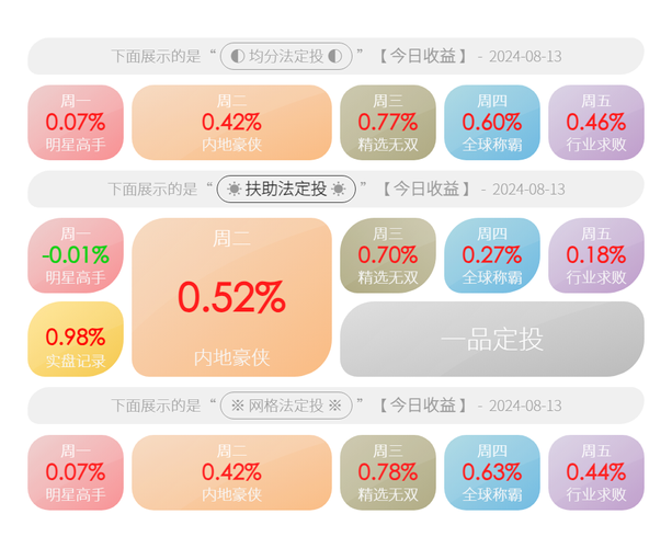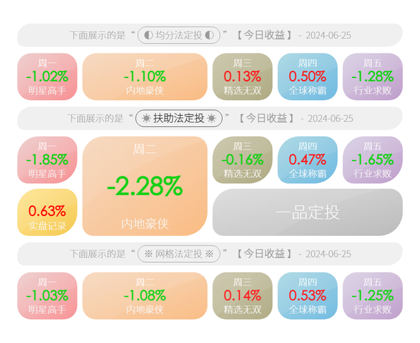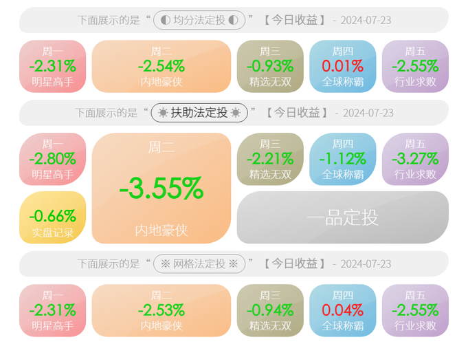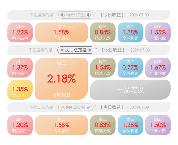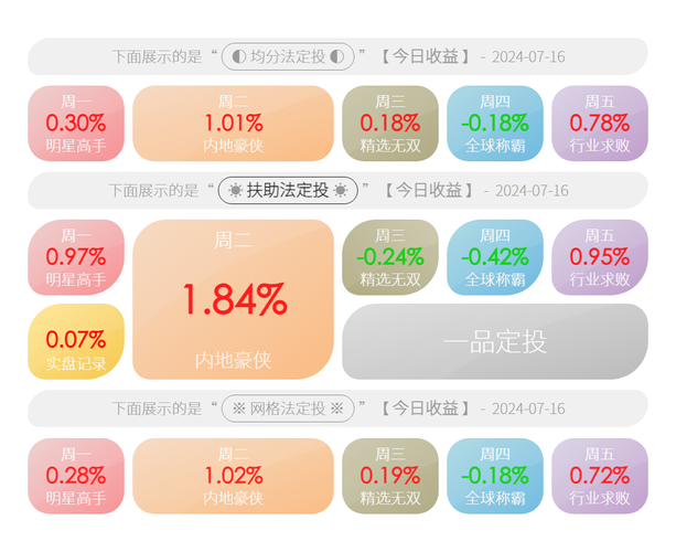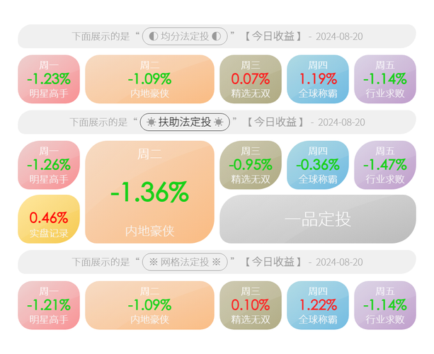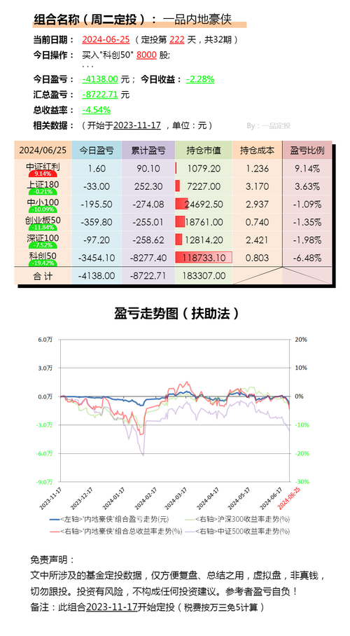 关于基金定投怎样投?更赚钱?你想看的数据,这里都有。今日收益目录01、前言02、今日定投03、指数估值表√04、各组合数据汇总01、前言写在前面的话:据说,网上所有定投的基金组合,拉长年限,整体收益差别不大,为了更好验证,特意组建不同风格的定投组合,静观其变!期盼,这些冰冷的数据配合特定的公式、方法,变得越来越有温度℃。观数据,掌方法,知盈亏!希望大家都能测算出适合自己的定投模型。...