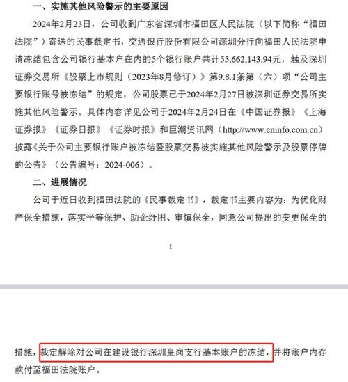 $ST中装(SZ002822)$7月25日公告,为优化财产保全措施,践行平等保护、助企纾困、审慎保全原则,经福田法院裁定,公司在建设银行深圳皇岗支行的基本账户已获解除冻结许可,账户内存款已划转至福田法院账户。尽管账户尚未全部解冻,但毋庸置疑,基本户的解冻意义重大。一方面,这将极大地缓解日常经营支付活动的受限程度;另一方面,有助于恢复公司的商业信誉和市场地位,有望加速脱离困境。法院的裁定,呈现出了...