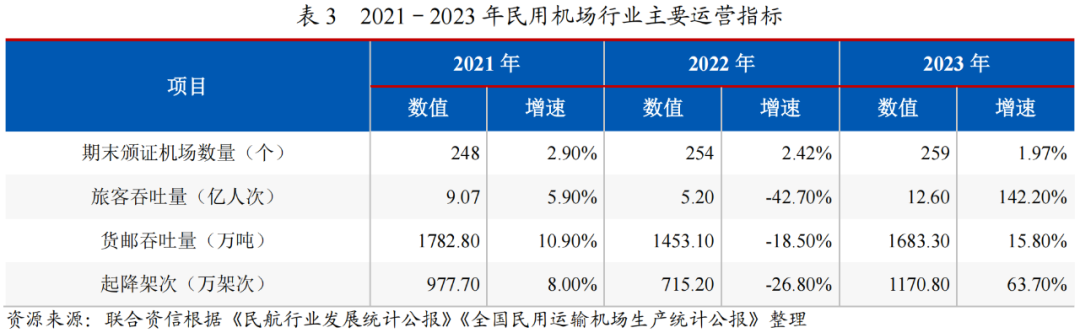 更多行业资讯关注联合资信一、行业概况机场是重要的交通基础设施,是我国综合交通运输体系的重要组成部分,是航空业稳定发展的基础。机场行业与国内外宏观经济的发展、居民收入水平等密切相关,且受民航业的影响很大。机场行业是为国民经济活动提供运输服务的基础性行业,机场建设以及收费管理方面均受到中国民用航空局(以下简称“民航局”)等政府部门的严格管理。截至2023年末,中国境内共有民用航空(颁...