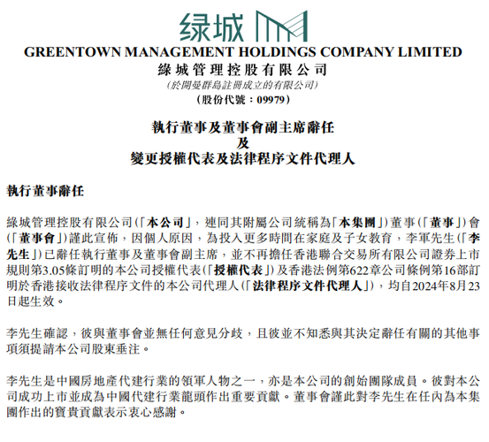 上周五(8月23日)时,绿城管理公布了2024年的半年度简报,也顺带发出了一则重磅公告:绿城管理集团执行董事兼董事会副主席李军辞职。李军是绿城管理的元老级领军人物,这次是主动提的离职,公告中说是出于:“个人原因”、“为投入更多时间在家庭及子女教育”。李军大约是在一年前升任为绿城管理副主席的,当时任命通知刚下来,艳姐就看到其发了一条朋友圈,作为重度游戏迷,闯荡《暗黑破坏神》20多年的李军说...