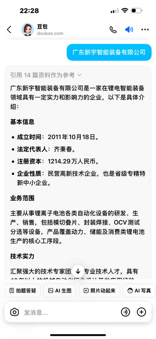 $海伦哲(SZ300201)$$电子烟(BK0865)$广东新宇智能装备有限公司是一家在锂电智能装备领域具有一定实力和影响力的企业,以下是具体介绍:基本信息•成立时间:2011年10月18日。•法定代表人:齐秉春。•注册资本:1214.29万人民币。•企业性质:民营高新技术企业,也是省级专精特新中小企业。业务范围主要从事锂离子电池各类自动化设备的研发、生产、销售,包括模切叠片、封装...