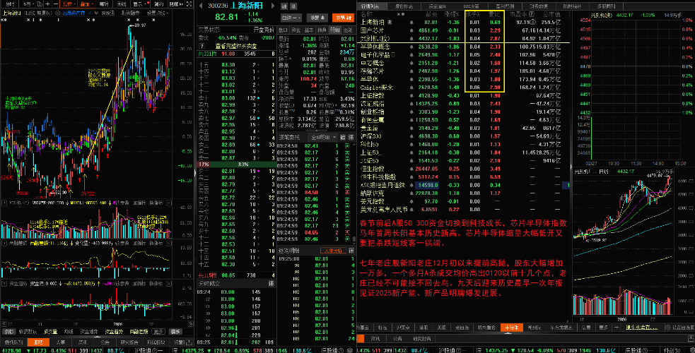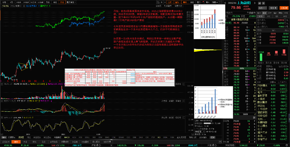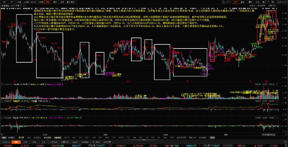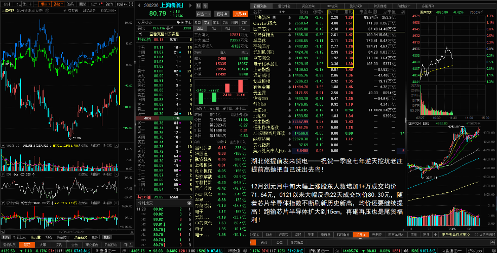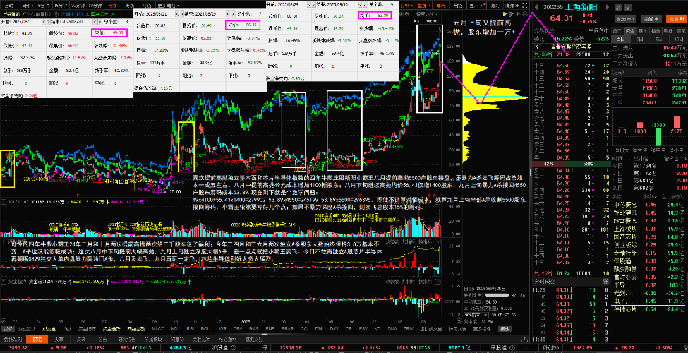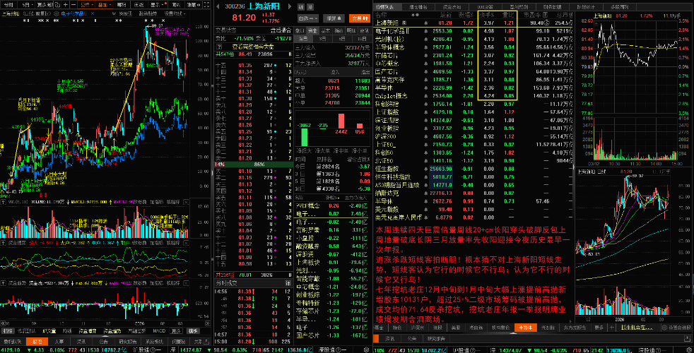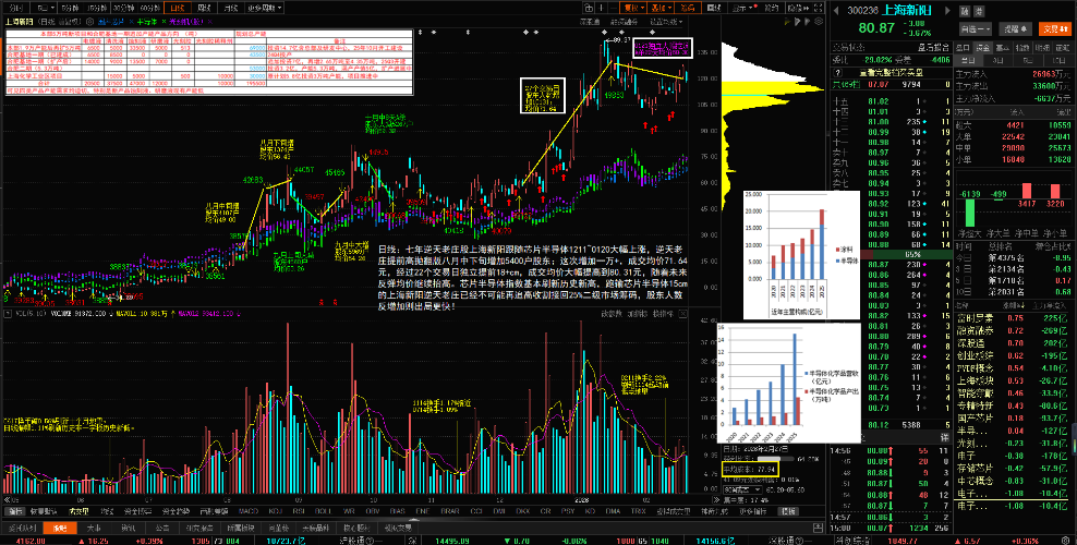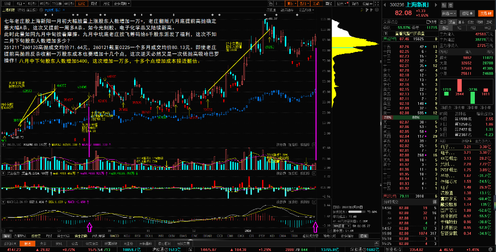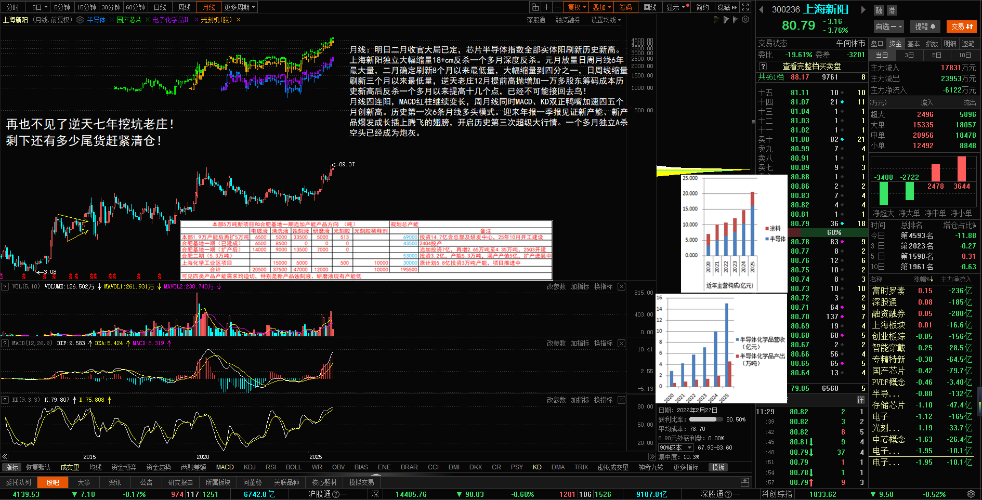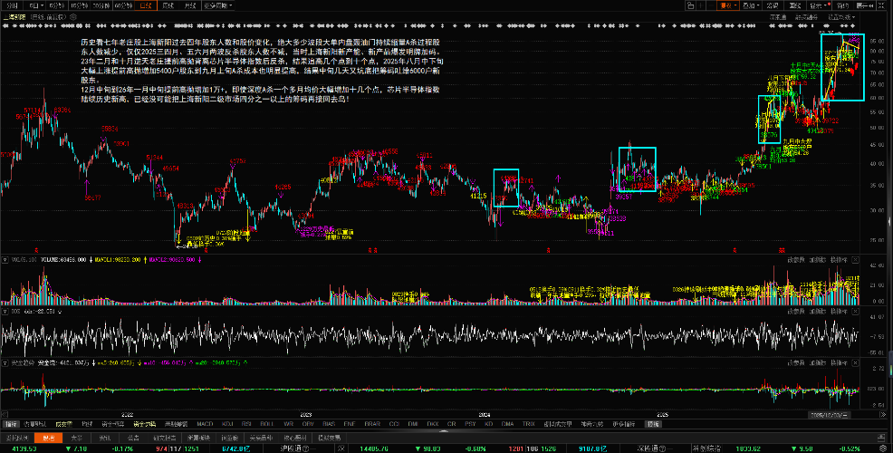 - 日线:七年逆天老庄股上海新阳跟随芯片半导体1211~0120大幅上涨,逆天老庄提前高抛翻版八月中下旬增加5400户股东;这次增加一万+,成交均价71.64元,经过22个交易日独立提前18+cm,成交均价大幅提高到80.31元,随着未来反弹均价继续抬高。芯片半导体指数基本刷新历史新高,跑输芯片半导体15cm的上海新阳逆天老庄已经不可能再追高收割接回25%二级市场筹码,股东人数反增加则出局更快!