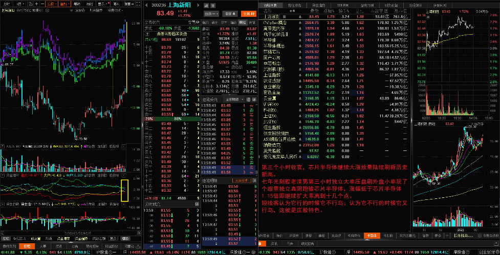 $中芯概念(BK0935)$$光刻机(胶)(BK0884)$$电子化学品Ⅱ(BK1039)$ 第三个小时收官,芯片半导体继续大涨放量陆续刷新历史新高。 七年光刻胶老渣男第三小时独立大单压盘刷外盘小单玩了个缩量独立真阴跑输芯片半导体,涨幅低于芯片半导体1.15倍即继续扩大乖离到十几个点。 短线客认为它行的时候它不行鸟;认为它不行的时候它又行鸟,这就是庄股特色。