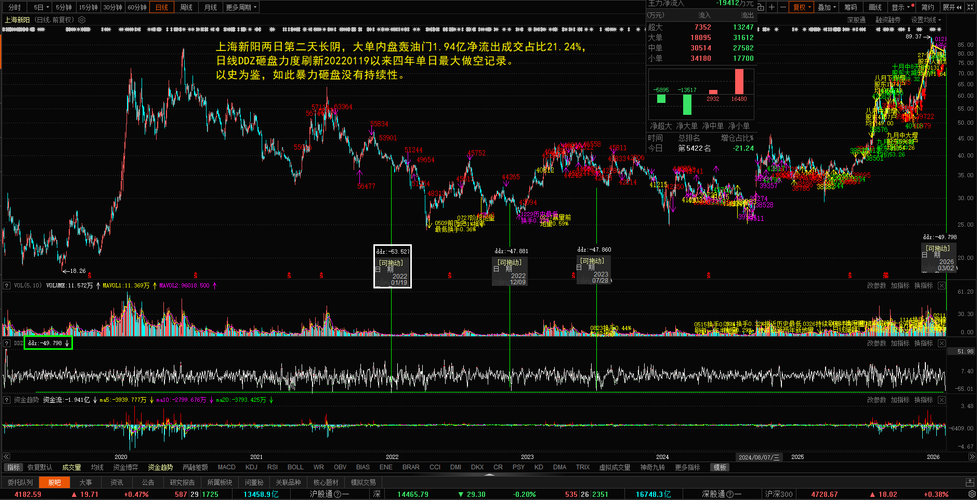 $中芯概念(BK0935)$$光刻机(胶)(BK0884)$$国产芯片(BK0891)$ 上海新阳两日第二天长阴,大单内盘轰油门1.94亿净流出成交占比21.24%,日线DDZ砸盘力度刷新20220119以来四年单日最大做空记录。 以史为鉴,如此暴力砸盘没有持续性。