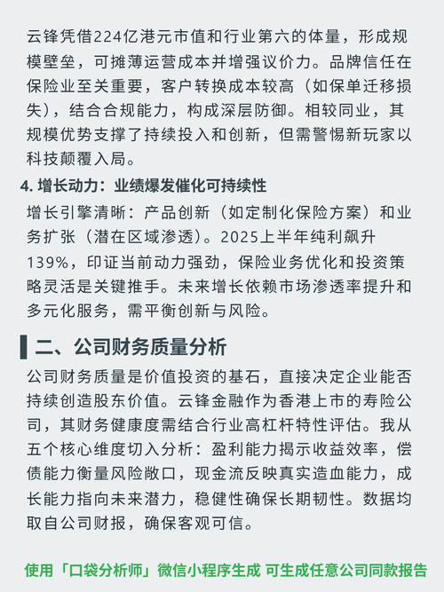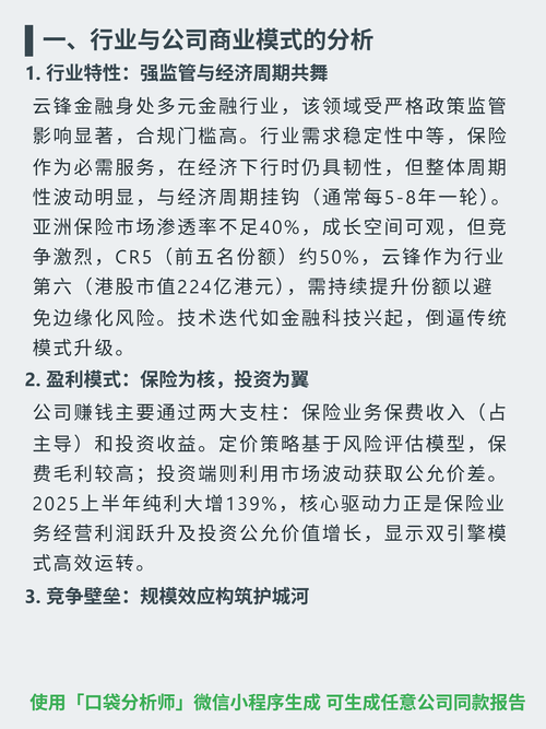 $云锋金融(HK|00376)$$蚂蚁概念(BK0937)$$阿里巴巴(NYSE|BABA)$挖了一份云锋金融的研报,核心逻辑是保险+投资双引擎驱动,但盈利稳定性和ROE是关键观察点。 核心逻辑:云锋金融属多元金融行业,强监管、高合规门槛,周期性明显。商业模式以保险业务(保费收入主导)+投资收益为双引擎,保险业务在经济下行时具韧性。 财务亮点:2025上半年纯利同比增139%(保险业务驱动);20...