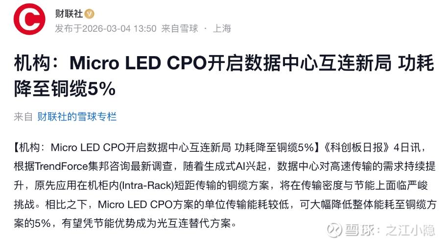 能耗直降95%,微软、台积电、联发科都在押注。今天A股上演“光电涨停潮”,华灿光电、聚灿光电集体20cm。这到底是真技术突破,还是又一个故事? 收盘了,聊聊今天这个最靓的仔——MicroLEDCPO。 一、今天发生了什么? 3月5日,A股涨幅榜前排被“光电”包揽。华灿光电、聚灿光电、聚飞光电、雷曼光电等多只MicroLED概念股20cm涨停。 板块涨幅近9%,超20只个股涨停或涨超10%。这阵势,...