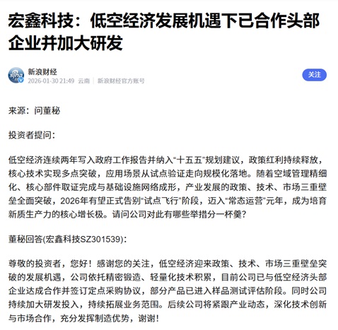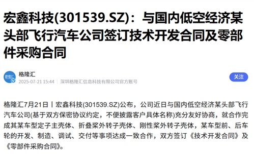 公司与飞行汽车头部企业达成战略合作,获核心零部件订单!飞行汽车赛道获新突破!宏鑫科技(301539):公司将研发制造核心零部件,推动低空经济产业链发展,抢占未来市场先机。 @妙想近日,国内汽车零部件领域传来重磅消息。宏鑫科技正式宣布与国内低空经济领域某头部飞行汽车企业达成战略合作。根据双方签署的《技术开发合同》和《零部件采购合同》,宏鑫科技将负责该企业某飞行汽车车型的核心部件研发制造,包括定子主壳...