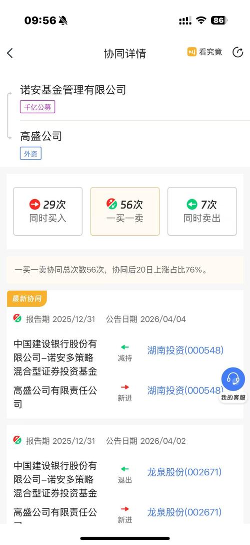 看到了一组数据,发现高盛和诺安经常有同步操作啊,一买一卖的操作尤其多,最近又操作了湖南投资,龙泉股份等票,而且他们出现同步操作高达56次,股价上涨的占比也很高,这次的两票还会延续规律吗?$龙泉股份(SZ002671)$$湖南投资(SZ000548)$