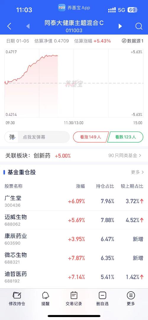 公募基金创新药持仓占比提至5.7%,机构都在加仓!今天板块大涨,估值还在地板,我跟着加码,持有优质基金,躺着吃红利不香吗?$同泰大健康主题混合C$ #挖掘超额收益#
