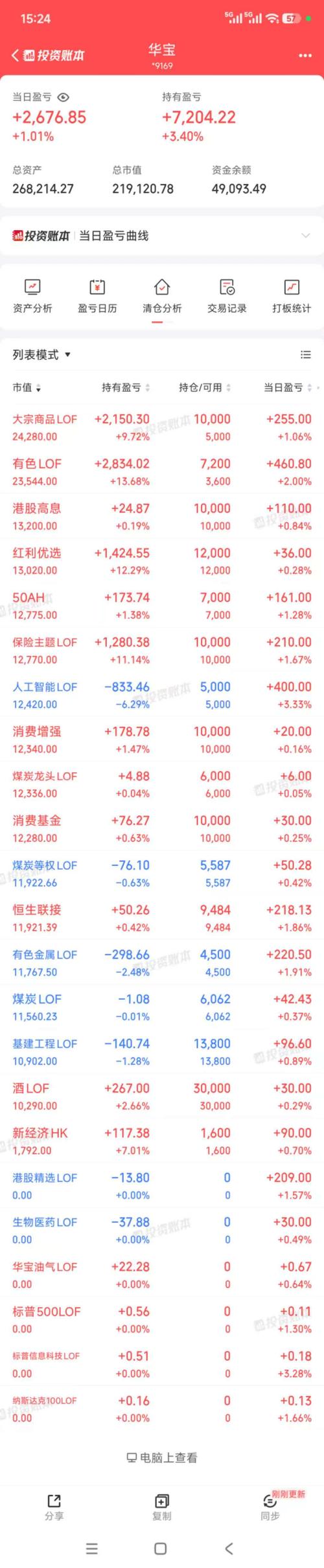 4612只个股上涨,759只个股待涨,中位数涨1.29%,成交额2.27万亿。 红包行情,创业板、科创板为代表的科技板块涨幅较大,老登板块比较低调,白酒尾盘才拉红。 沪银大涨8.9%,国投白银LOF(161226)开板了,今天大涨8.36%,溢价55.61%,暂停申购,我不去参与,看戏就好。 我持有较多的老登资产(红利、消费、煤炭、基建等),行情好的时候套利也没什么机会,是跑不赢指数的,自己也有预...