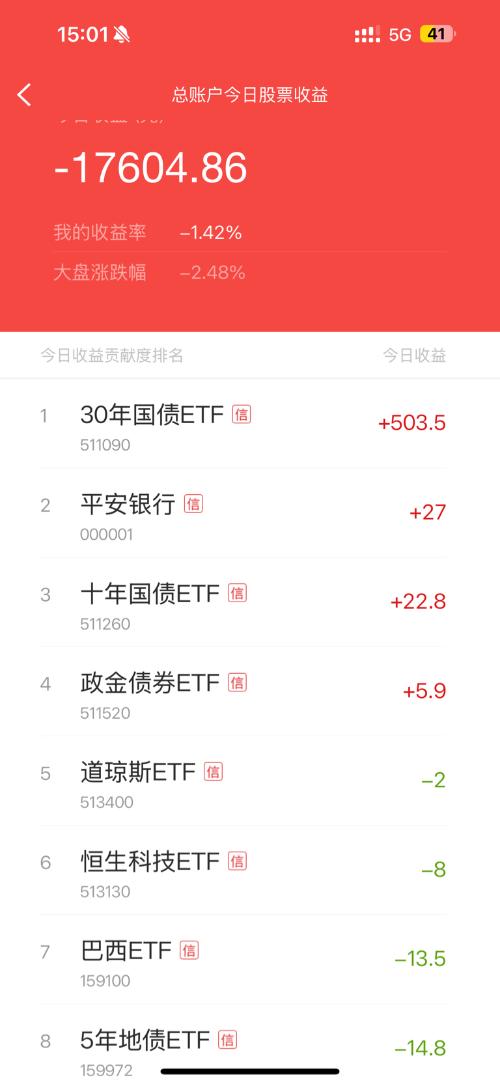 今日收益-17604.86 收益率-1.42%(大盘-2.48%,跑赢大盘1%) 太惨了太惨了,虽然今天也跑赢了大盘,但操作失误特别多。还在靠对冲账户勉强小赚。 每日实盘记录自己的每日收益。 融资融券账户,持仓90%为T0的ETF,目标无论牛市、熊市,尤其熊市,可以稳定保持10%的年化收益。 今日收益贡献TOP3: 1、$30年国债ETF(SH511090)$ 2、$十年国债ETF(SH511260)$...