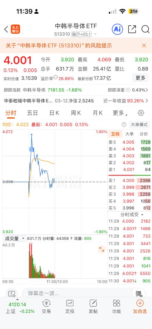 $中韩半导体ETF华泰柏瑞(SH513310)$基金管理人是否考虑通过分拆份额提高流动性和小资金成交匹配度,以此达到缓解高溢价。很多其它3-4元的ETF都有分拆先例,甚至前不久一个2.8元的也有分拆。也降低大家的资金压力。