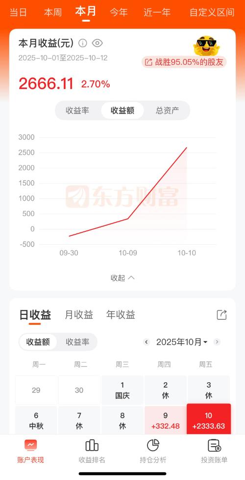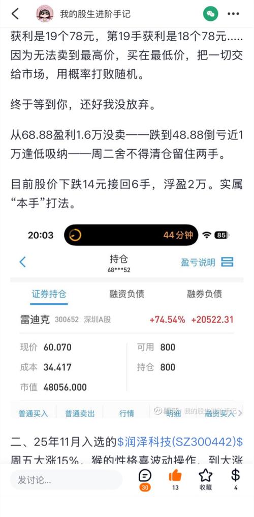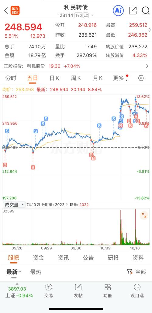 (一)炒股 本周 我亏了,亏了一块钱。 国庆期间,港股通融创中国和海低捞跌了不少, 周五创业板指大跌4%,我持仓情况是这样的 我持有的股不是波澜不惊,都是风起云涌正负五个点以上的涨跌幅,但是他们都好乖的,此涨彼消,以致于市值6位数,波动只有1元钱。 不可思议的是东财小账户得益于利民转债大涨这两天都是盈利的 利民转债不出意外的话下周可以实现扭亏为盈了。因为贴着K线做起了买卖,亏盈都不大,主打一个参与...
