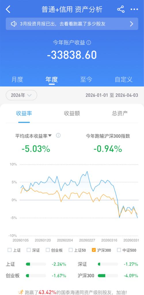 (一)股票资产分析 一、本周主账户浮亏1.98万2026年浮亏3.38万,仅跑赢43.43%国泰海通同资产股友。 历史回顾2023年跑赢85.47%;2024年跑赢86.38%;2025年跑赢78.8%;开户至今跑赢88.46%。 按七亏二平一盈的定律,始终没有进入10%前列。 2026年3月亏损创历史最高,但2月才创下市值历史新高啊