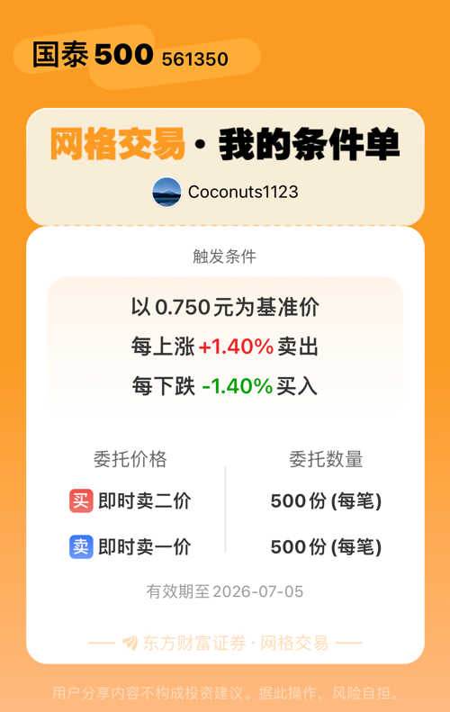 #条件单交流##网格交易晒单#一位股神设置了一个网格交易条件单,接下来就是见证奇迹的时刻~$国泰500(SH561350)$