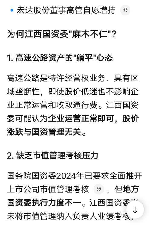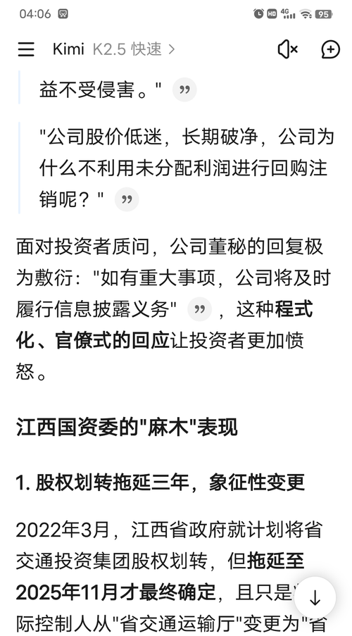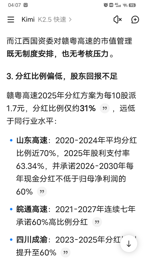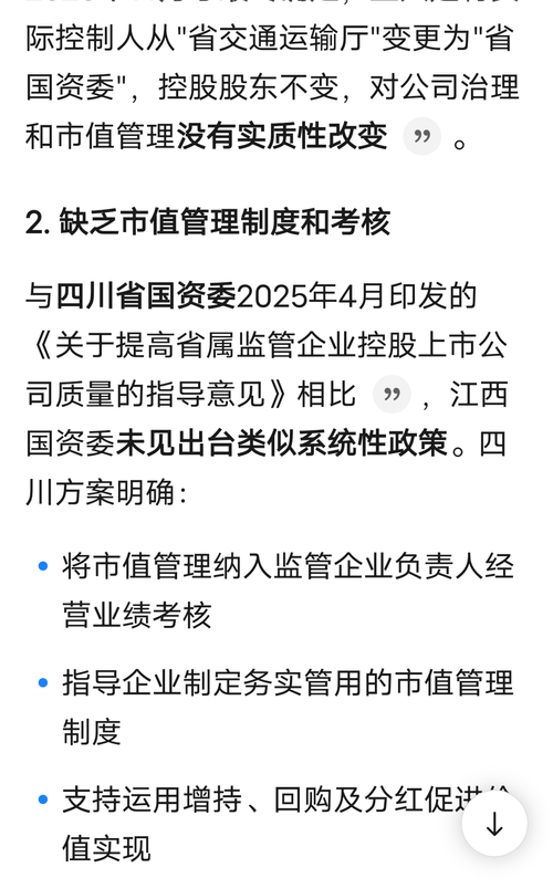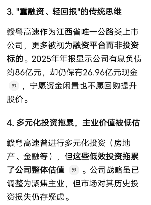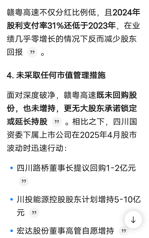 【问】贵公司作为一家长期破净公司,市净率远低于行业平均水平,去年3月份出台了《估值提升计划》,但一年来市值不升反跌,请问贵公司接下来有何打算?公司上一次发布分红规划还是在2021年,说要将分红比例提升到60%,但从未兑现,成为市场的笑柄。现在樟吉改扩建也通车了,是时候出台分红规划,将分红比例提升到行业主流水平,挽回声誉了。否则的话,长期破净还谈什么“奋力打造一流上市国有资本投资运营平台”啊!!!【答】赣粤高速:尊敬的投资者,您好!您的建议我们将转呈公司管理层,公司将以贯彻落实《“提质增效重回报”行动方案》《估值提升计划》为抓手,继续做好相关工作。感谢您对公司的建议和关注!
