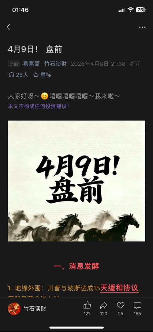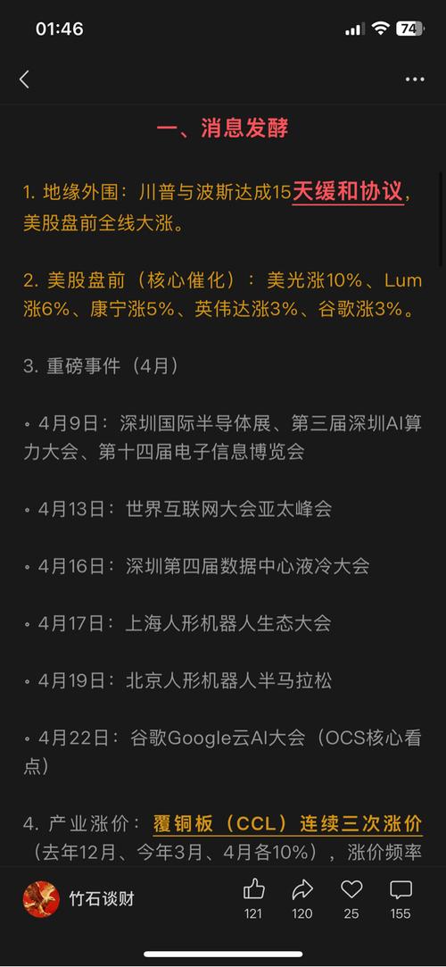 $巨力索具(SZ002342)$$浙文互联(SH600986)$$杭电股份(SH603618)$ 一、消息发酵 1.地缘外围:川普与波斯达成15天缓和协议,美股盘前全线大涨。 2.美股盘前(核心催化):美光涨10%、Lum涨6%、康宁涨5%、英伟达涨3%、谷歌涨3%。 3.重磅事件(4月) 4月9日:深圳国际半导体展、第三届深圳AI算力大会、第十四届电子信息博览会 4月13日:世界互联网大会亚太峰...