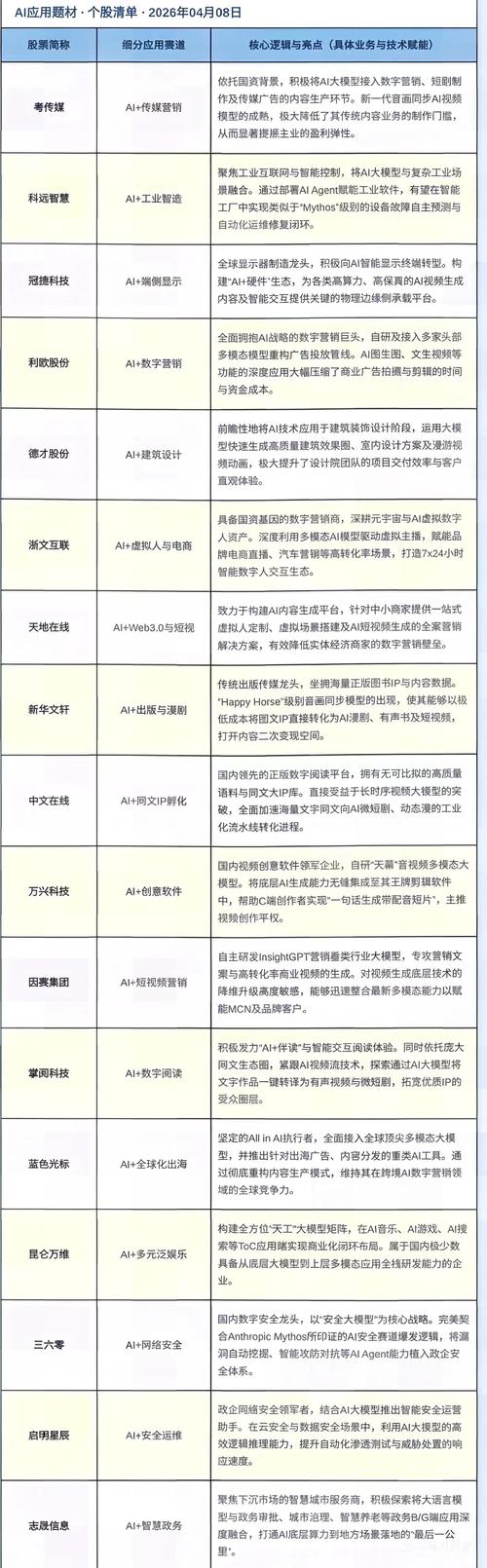一、题材回顾: 1、AI应用: 1板: 省广传媒、法狮龙、电广传媒、引力传媒、欢瑞世纪、蓝色光标、志晟信息、天地在线、浙文互联、德才股份、利欧股份、达实智能、科远智慧 2板: 粤传媒、普邦股份 浅论: 板块有利好叠加外围动乱缓和带动的板块走强,板块有主动性进攻的个股,但是非市场合力,进攻强度一般,暂时定义为市场情绪回流的反推吧,非主动性的走强,板块预期有限,板块领涨股可能还能表现一下,所以注意聚焦...