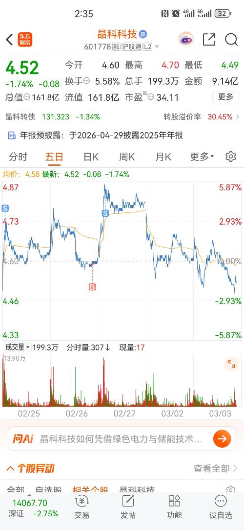 $晶科科技(SH601778)$10.30-11.30二次冲高测压,下午大概在5.1左右