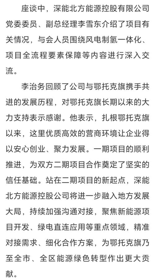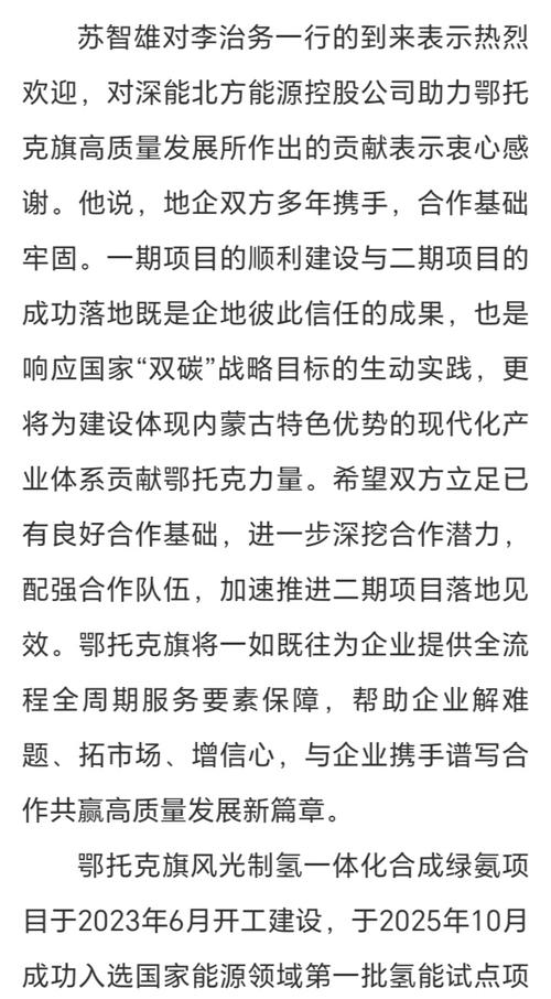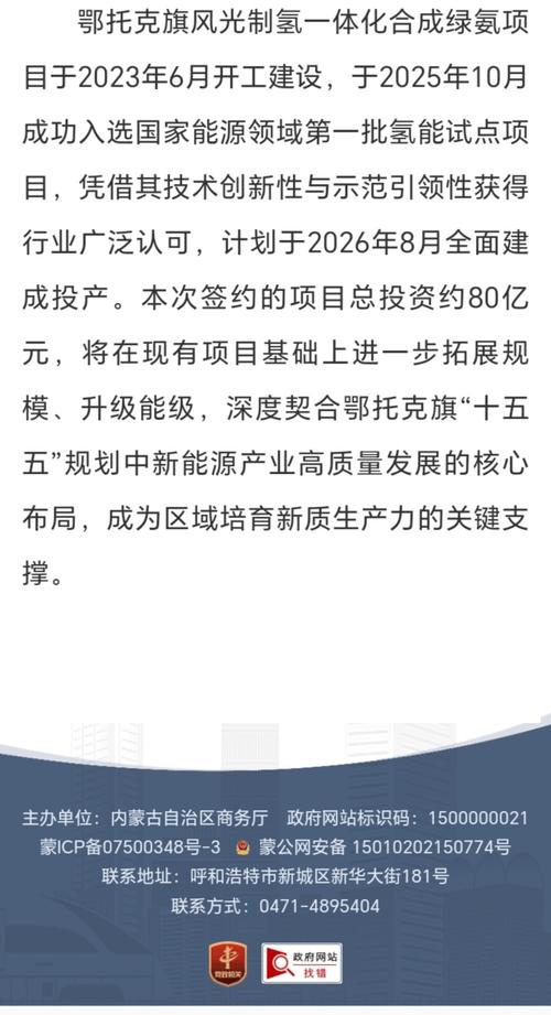 鄂托克旗风光制氢一体化合成绿氨项目于2023年6月开工建设,于2025年10月成功入选国家能源领域第一批氢能试点项目,凭借其技术创新性与示范引领性获得行业广泛认可,计划于2026年8月全面建成投产。 本次签约的项目总投资约80亿元,将在现有项目基础上进一步拓展规模、升级能级,深度契合鄂托克旗“十五五”规划中新能源产业高质量发展的核心布局,成为区域培育新质生产力的关键支撑。