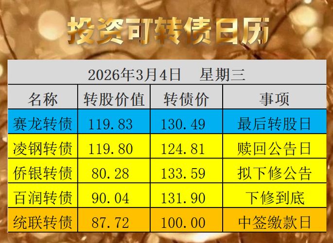 原文发送于昨日晚间自媒体。 祥和转债中签率公告显示,股东配售率约为91%,网上申购户数约为874万户,中一签的概率为0.4%,即平均233个账户中一签,特难中签。4日收盘摇中签尾号,本号网友可以实施“留言中签发大财”策略。 凌钢转债即将到期,公司宣布到期赎回,利空转债,详见赎回信息列表。 侨银转债满足下修条件,公司提出下修议案,利好转债,详见下修信息列表。 百润转债下修议案获得通过。公司宣布转股价...