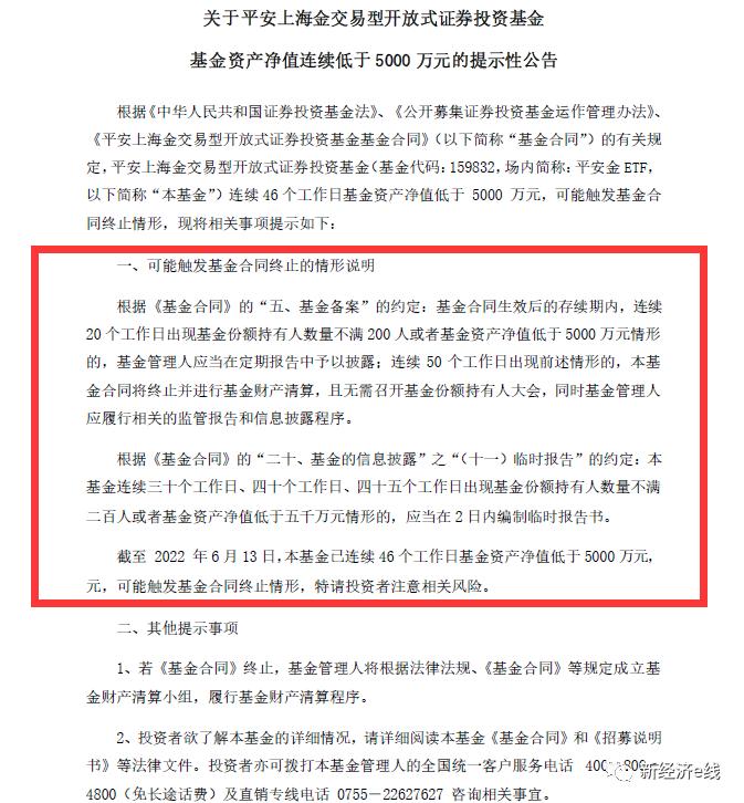原创新经济IP新经济e线2022-06-1509:24发表于广东收录于合集#ETF25个#基金清盘10个“理想很丰满,现实很骨感。”随着ETF市场由蓝海进入红海之争,部分有意借ETF实现突围的基金公司愿望恐怕要落空了。6月14日,平安金ETF(159832)发布提示性公告称,截至2022年6月13日,该基金已连续46个工作日基金资产净值低于5000万元,可能触发基金合同终止情形。按照《...