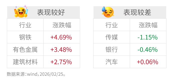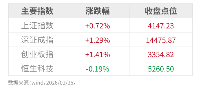 2月25日,A股市场高开高走,稀土与小金属板块爆发。上海市近日出台新一轮房地产支持政策,明确优化限购措施、加强住房信贷支持、完善房产税相关政策,重点聚焦支持刚性和改善性住房需求。此次调整释放积极信号,旨在稳定市场预期、促进合理住房消费,推动房地产市场平稳健康发展。 市场回顾: 2月25日,A股三大指数集体收涨,创业板指领涨,涨幅达1.41%。市场情绪持续回暖,全市场成交额约2.48万亿元,较前一交...