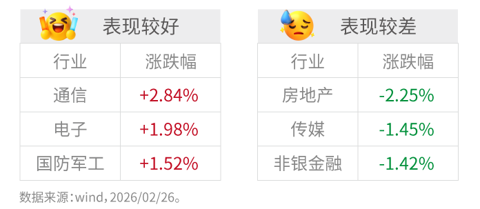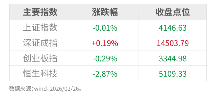2月26日,A股市场全天呈震荡分化走势,主要股指小幅收跌,个股跌多涨少,但科技与资源板块表现相对活跃。同日盘中,离岸人民币兑美元汇率升破6.84关口,创下2023年5月以来新高。人民币汇率持续走强,对市场情绪形成一定提振,有助于吸引外资流入,并对部分上市公司的盈利状况构成支撑。 市场回顾: 2月26日,A股主要指数涨跌互现。其中,上证指数微跌0.01%,收报4146.63点;万得全A指数上涨0.2...