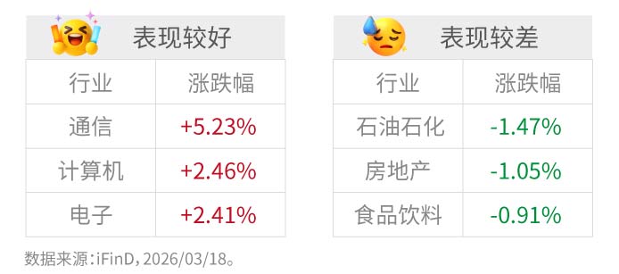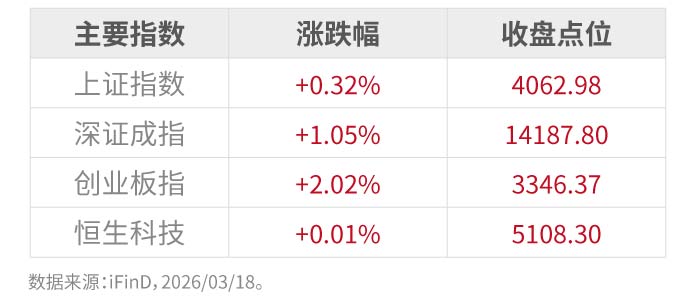 3月18日,A股市场震荡回升,全市场超3500只个股上涨,算力产业链爆发。财政部明确2026年将实施更加积极的财政政策,重点包括扩大财政支出规模、优化政府债券工具组合、提高转移支付效能、强化重点领域保障,并加强财政金融协同,以激发微观主体活力。政策加力提效有望增强地方可用财力,为基建投资、科技创新及新质生产力发展提供有力支撑,进一步夯实经济复苏基础。 市场回顾: 3月18日,A股三大指数集体收涨,...