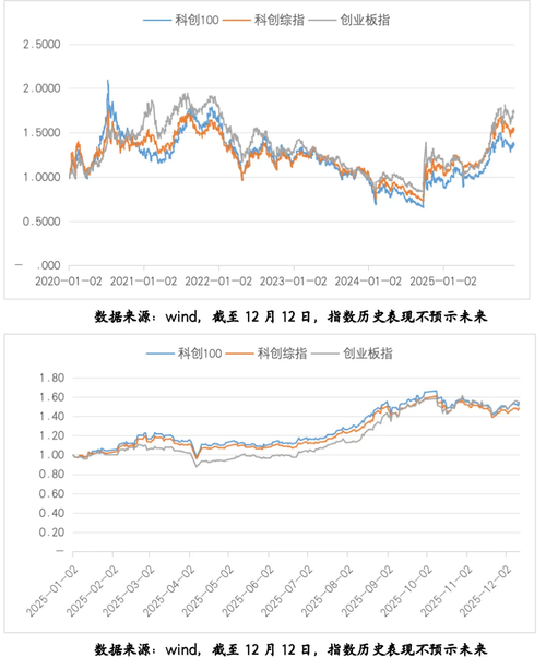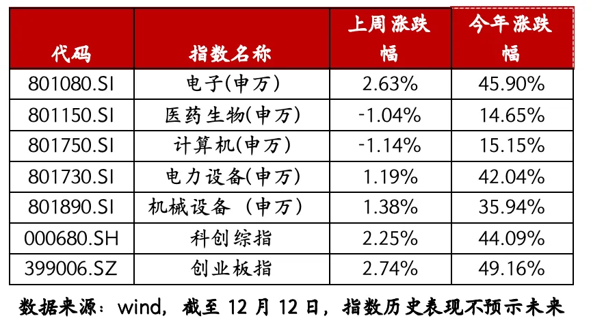 一、科创创业宽基指数概况 1、科技板块概况 上周科创、创业板块均反弹超2%。各细分行业表现继续分化,机械设备、电子、电力设备行业延续较强走势,医药生物、计算机继续走弱。 2、科创宽基指数概况 上周科创100指数、科创综指指数以及创业板指数均上涨,创业板指数表现强于科创系列指数。过去5年,上述3只指数自2021-2022年高点以来总体下行,但2024年9月26以来迎来显著修复,截至今年12月12日,...