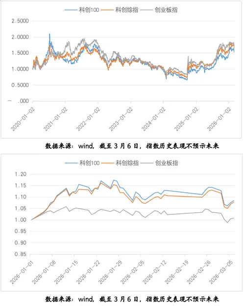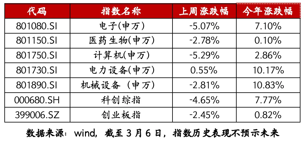 1、科技板块概况 上周市场受中东局势影响有所回调,科创综指下跌4.65%,创业板指下跌2.45%,各细分行业均有一定程度回调。 2、科创宽基指数概况 上周科创100指数、科创综指、创业板指数均有回调。过去5年,上述3条指数自2021-2022年高点以来总体下行,但2024年9月26以来迎来显著修复。截至今年3月6日,科创100指数合计上涨55.99%,科创综指上涨70.12%,创业板指上涨76.2...