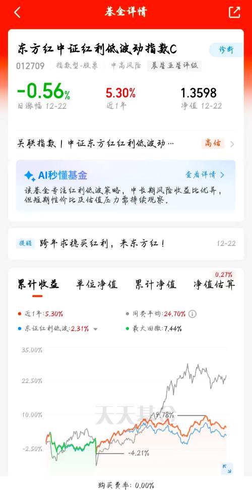 年末避险的绝佳选择就是东方红中证红利低波动指数C,它的红利低波策略抗跌性强,市场调整时正是上车机会,降息环境下这类产品会更受追捧。
