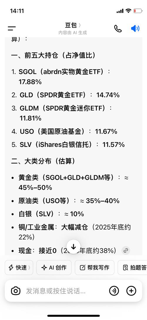 abrdnPhysicalGoldShares(SGOL):持仓占比17.88%(黄金相关ETF)SPDRGoldShares(GLD):持仓占比14.74%(黄金相关ETF)SPDRGoldMiniShares(GLDM):持仓占比11.81%(黄金相关ETF)UnitedStatesOilFund,LP(USO):持仓占比11.67%(原油相关ETF)iSharesSilverTrust(SL...