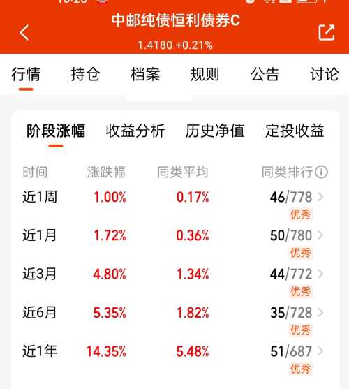 今天打开账户一看,其他债基全绿,就$摩根双债增利债券C$红彤彤收了22个蛋!这业绩太稳了,回撤还特别小,这种行情里简直就是避风港啊