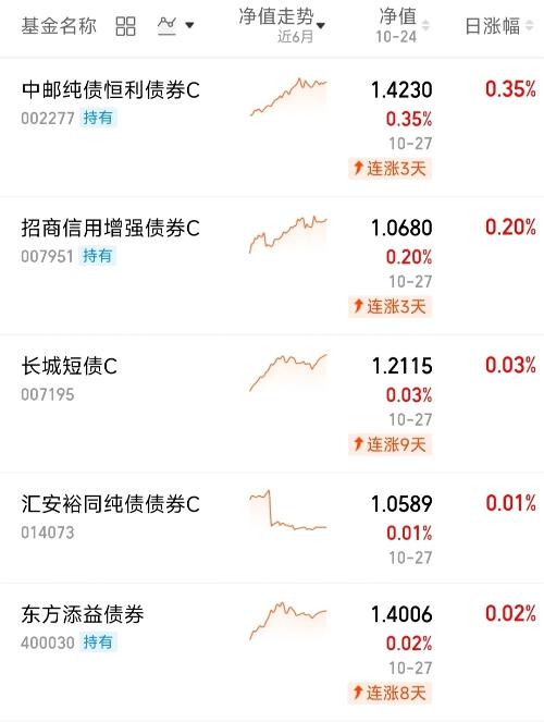 刚看了下$中邮纯债恒利债券C$,35个蛋到账,太开心!这只只投可转债和纯债,混债中波动算小的,0.3%管理费属最低档,近半年600多蛋入账。