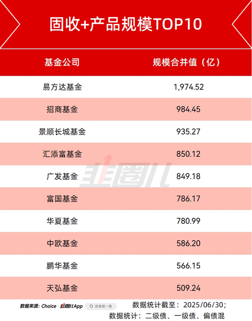 昨天公募披露完了二季报,固收+规模继续飙涨。 我统计偏债混合类、二级债基、一级债基今年以来的规模变化,上半年固收+大类合计规模增长超2500亿。 其中景顺长城增幅排在第一位,中欧居于次席,中银排在第三。 截至2025/6/30,固收+规模Top10的格局依然清晰,易方达继续断崖领先。 因为张清华、胡剑、王晓晨三位无论在业绩稳定度以及机构、散户口碑这一块实力太强,他们三人挂名管理的产品规模合计就有1...