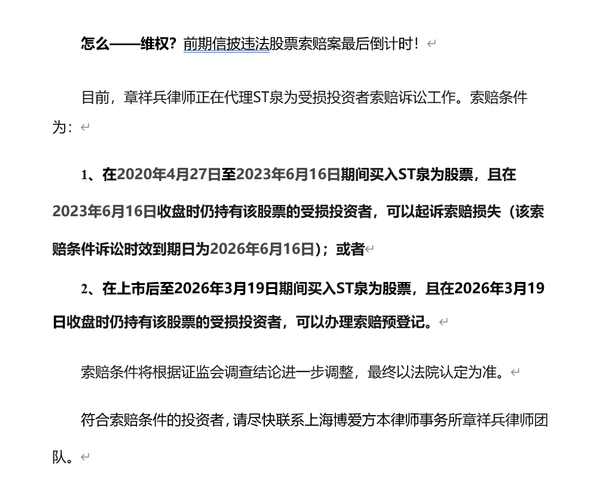 $ST泉为(SZ300716)$泉为科技(300716)因涉嫌信息披露违法违规,于2026年3月19日公告,公司及实控人、董事长褚一凡收到证监会《立案告知书》。受此利空影响,股价大幅下跌,投资者损失惨重。 凡在2026年3月19日之前买入300716泉为科技,且在2026年3月20日(含当日)之后卖出或继续持有者,符合索赔条件。符合条件的受损投资者,可通过“股索卫”团队登记索赔。团队实行“风险代理...