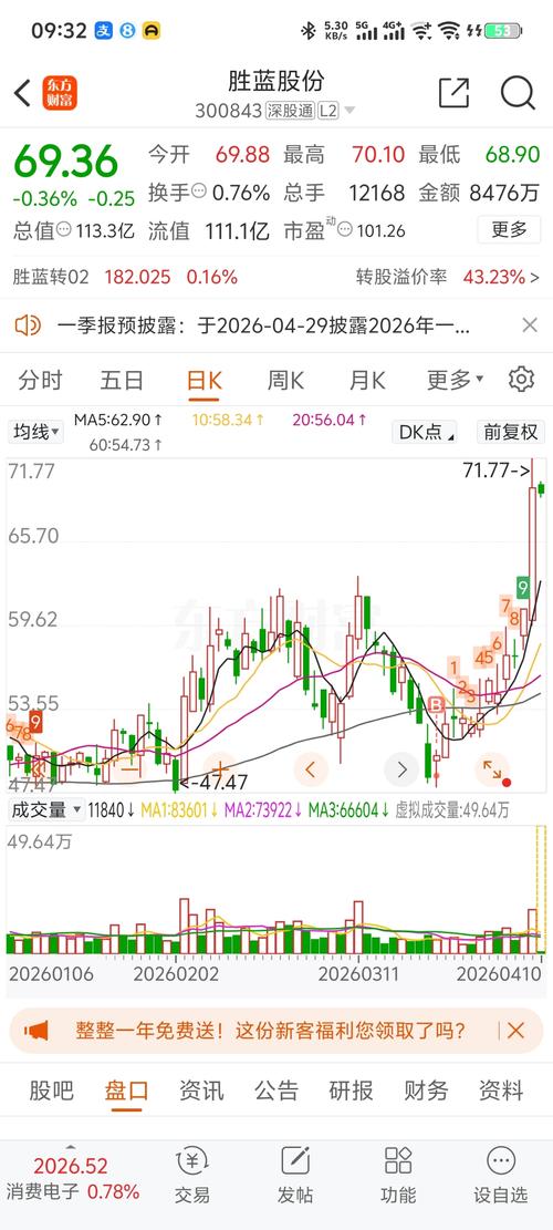 $胜蓝股份(SZ300843)$发现一个很有趣的数字,最高峰71.77-67.33(收盘价)=4.44
