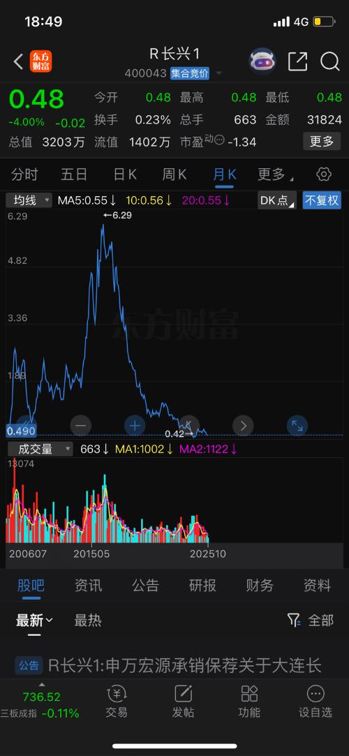 长兴的市值3000万,股本只有6000多万才4角6分,整个老三板找不到第二家。