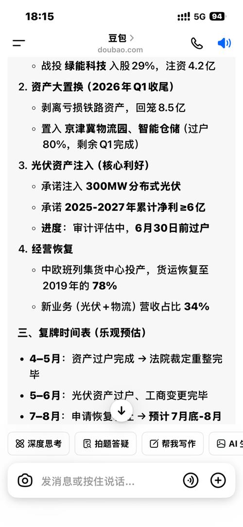 天津国恒铁路(R国恒1,400064)重整计划(2025年2月28日天津三中院裁定批准)核心是:债务重组、资产剥离置换、引入战投、业务转型“新能源光伏现代物流”。 一、重整核心背景 公司长期亏损、负债高企(约37亿元)、经营停滞天津法院 2019年首次重整失败,2025年重启并获法院批准 执行期:2025.2.28—2025.12.31(已按期完成) 二、债务重组方案(核心) 职工债权